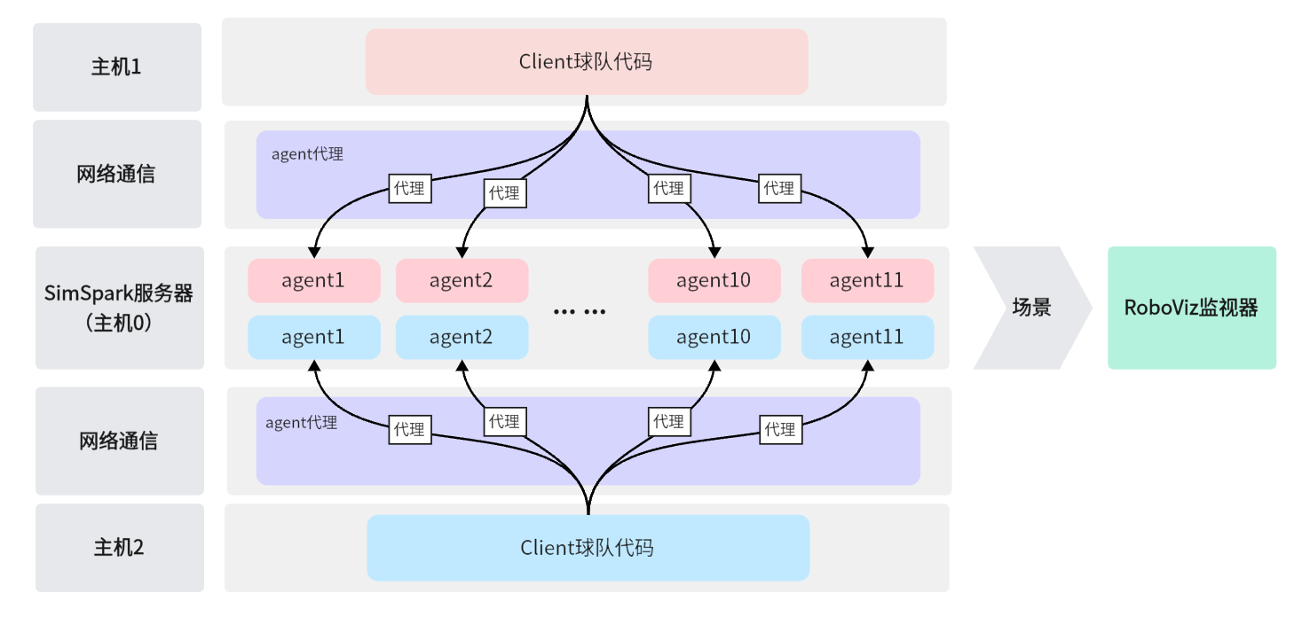 在正式比赛中,服务器将运行在单独的一台主机上,以此来保证仿真的实时性。双方球队的代码将运行在另两台或另一台主机上,通过局域网与服务器建立连接,实现Server与Client的循环通信。为避免各个agent的计算和网路延迟不同而导致仿真不一致的问题,在比赛时往往需要使用智能体代理(见下方Client Agent Proxy repository),将同一球队的不同agent的消息对齐后,一同发送到服务器上。与此同时,为直观地观察仿真状态,服务器会自动转发场景信息,可通过监视器(见下方RoboViz repository)观察球场环境,并执行开球等裁判命令。