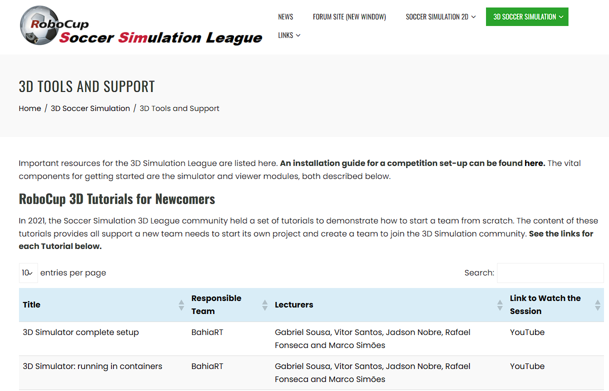 RoboCup仿真3D官网为新参与的队伍提供了相关教程,包括比赛环境的安装、往年比赛日志、交流群等,相关介绍如下:
